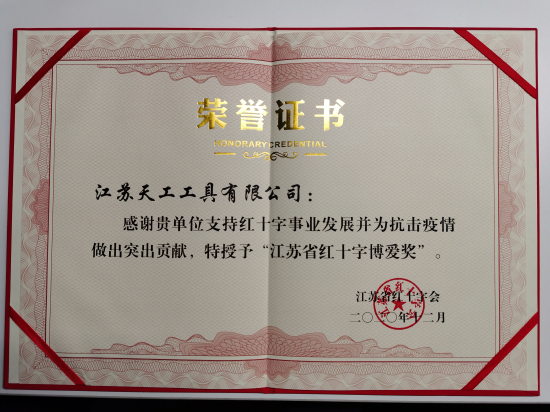 為了表彰今年以來在共同抗擊新冠疫情中作出重要貢獻的企業,近日,江蘇省紅十字會授予江蘇天工工具有限公司江蘇省紅...